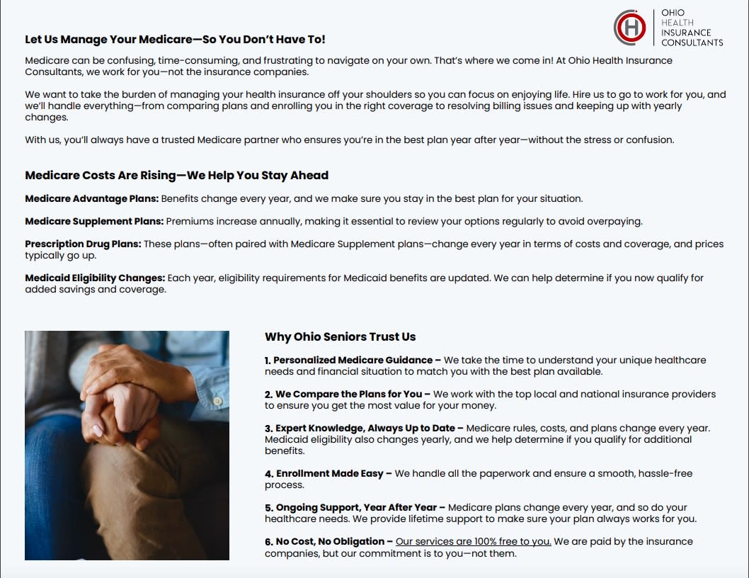 At Ohio Health Insurance Consultants, we are dedicated to serving the health insurance needs of Ohioans, with a special focus on Medicare beneficiaries aged 65 and older. However, our expertise doesn't stop there—we are here to help with all health insurance needs, offering guidance for people of all ages and income levels.